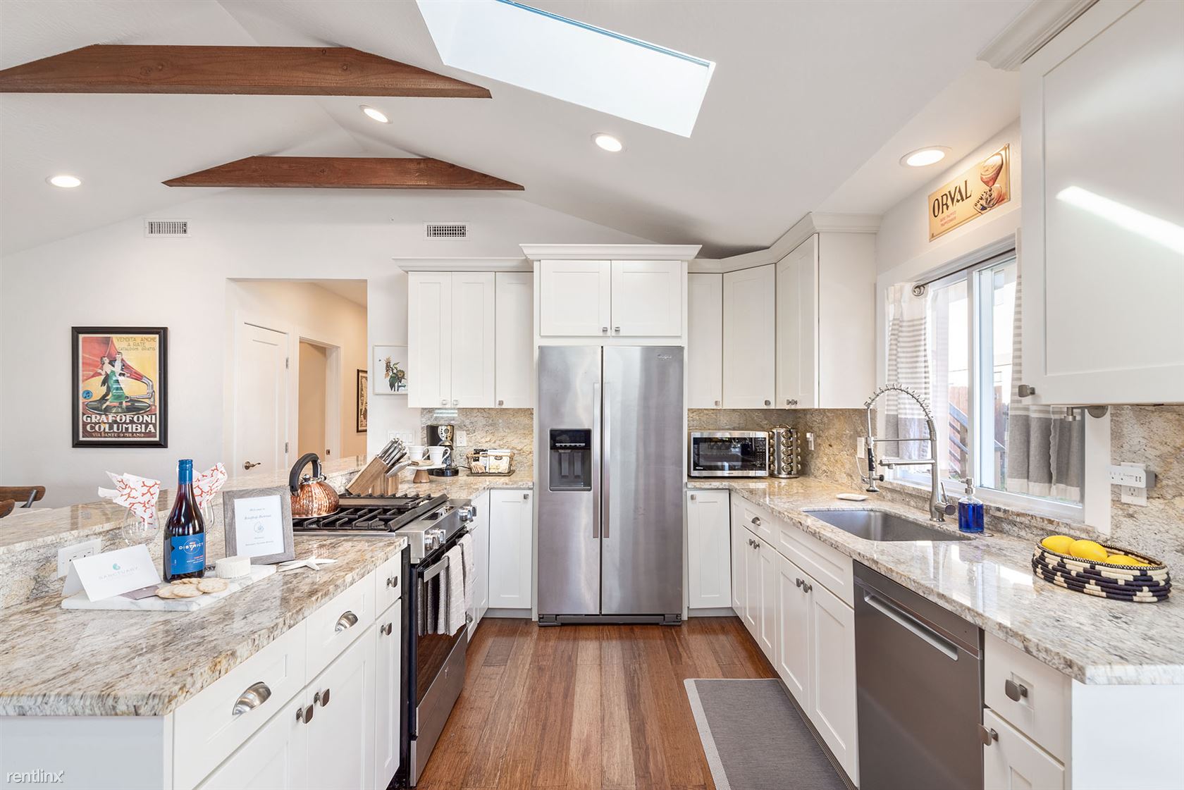 The open and airy great room space that includes the living room, dining room and open kitchen features beautiful wood flooring, a pitched ceiling with beams and a skylight. A peninsula provides seating for 4 looking into the wide galley style kitchen.